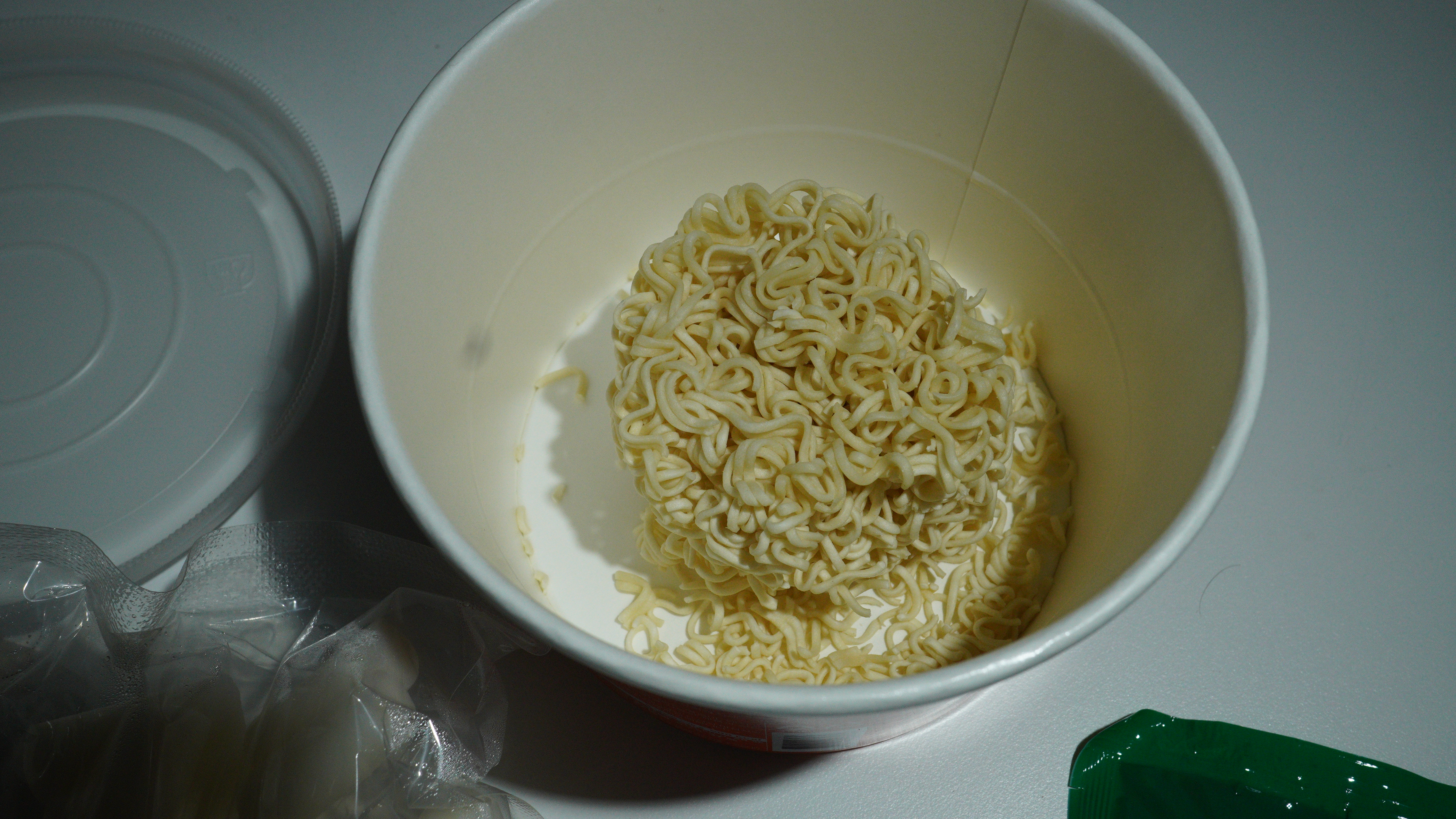 A. 안내 기준 뜨거운 물을 표시선까지 붓고, 뚜껑을 살짝 얹어 전자레인지 3분(1000W 기준)입니다.